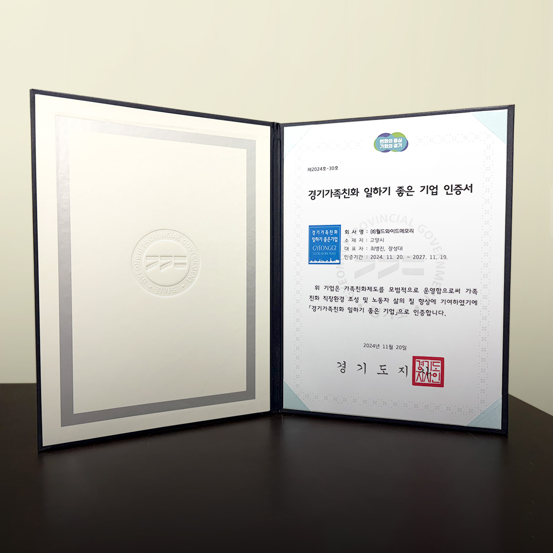 경기도가 주관하는 ‘2024년 경기 가족친화 일하기 좋은 기업’ 인증에서 월드와이드메모리가 우수 기업으로 선정됐다. 이 인증은 가족 친화적인 직장 문화를 조성하고 직원 복지와 일과 삶의 균형을 중시하는 기업을 발굴하고 인정하는 제도로, 월드와이드메모리는 그동안의 가족 친화적 정책과 복지 프로그램을 통해 직원들의 삶의 질을 향상시키고, 건강한 직장 문화를 구축한 점에서 높은 평가를 받았다.
